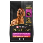 Purina Pro Plan Sensitive Skin and Stomach Salmon and Rice Formula provides complete and balanced nutrition for adult dogs with delicate digestion or skin sensitivities. Real salmon is the primary ingredient, offering high-quality protein for muscle strength. This formula includes prebiotic fiber to support gut health, rice and oatmeal for easy digestion, and fish oil rich in EPA and omega-3 fatty acids to promote joint health and mobility. Omega-6 fatty acids and vitamin A help nourish your dog’s skin and coat. The recipe contains no corn, wheat, or soy, ensuring a wholesome meal for sensitive pets.