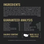 | Guaranteed Analysis | Crude Protein (Min) 26.0% Crude Fat (Min) 16.0% Crude Fiber (Max) 4.0% Moisture (Max) 12.0% Linoleic Acid (Min) 1.3% EPA (Min) 0.1% DHA (Min) 0.1% Calcium (Min) 1.0% Phosphorus (Min) 0.8% Selenium (Min) 0.35 mg/kg Vitamin A (Min) 15,000 IU/kg Vitamin E (Min) 460 IU/kg Vitamin C (Min) 70 mg/kg* Glucosamine (Min) 400 ppm* Omega-3 Fatty Acids (Min) 0.7%* Omega-6 Fatty Acids (Min) 1.5%* *Not recognized as an essential nutrient by the AAFCO Dog Food Nutrient Profiles. |