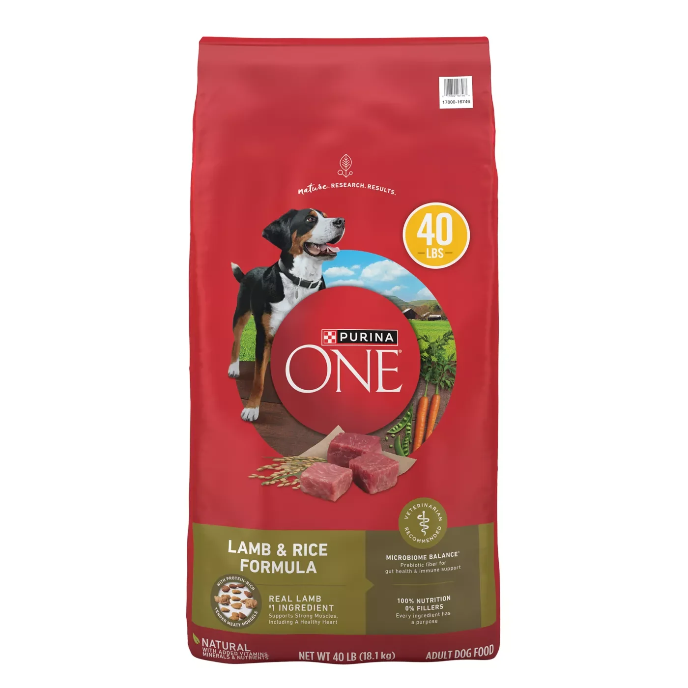 Discover what makes SmartBlend smart with Purina ONE Natural Dog Food Lamb and Rice Formula with added vitamins, minerals and nutrients adult dog food. Real lamb as the number 1 ingredient supports your dog’s strong muscles and healthy heart, while natural sources of glucosamine for dogs boost joint health. Each meal is a highly digestible combination of protein-rich, tender, meaty morsels and crunchy dog kibble for an irresistible taste with complete and balanced nutrition for adult dogs. Every bite of this digestive health dog food features prebiotic fiber to nourish gut health. This Purina ONE dry dog food has four antioxidant sources, Vitamins A and E, and minerals zinc and selenium for immune support for dogs and also contains Omega-6 fatty acids for healthy skin. Purina dog experts and nutritionists formulate Purina ONE dog food lamb and rice formula to deliver a positive impact on your dog’s health. Whether it’s bright eyes or a radiant coat, see the differences Purina ONE makes.
