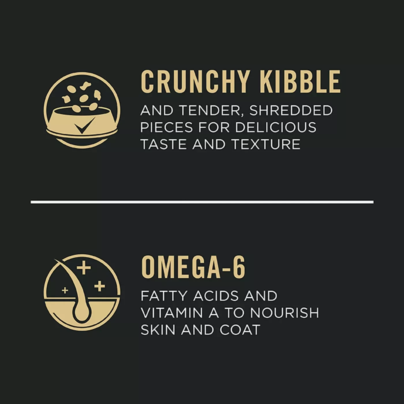 - Features a mix of crunchy kibble and tender shredded pieces for irresistible taste and texture.