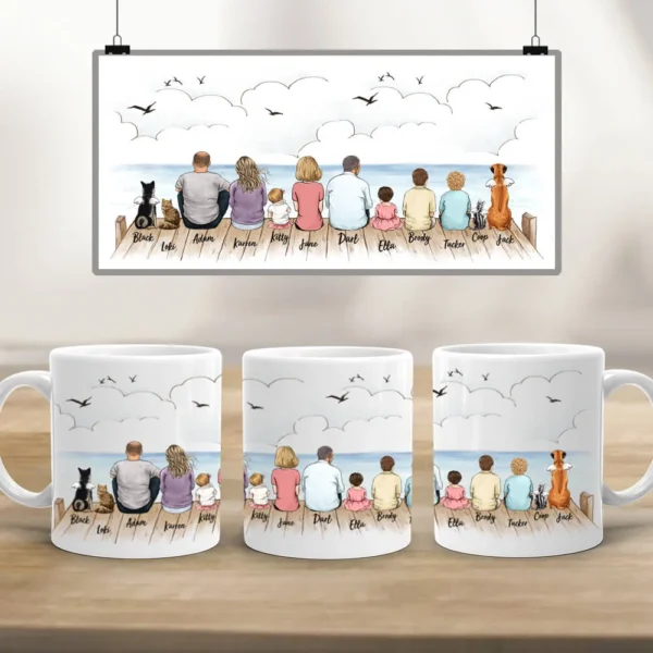 Personalized Edge to Edge coffee mug gifts with the whole family & dog & cat – UP TO 12 PEOPLE & PETS – Wooden Dock – A Novsend Original Gift
